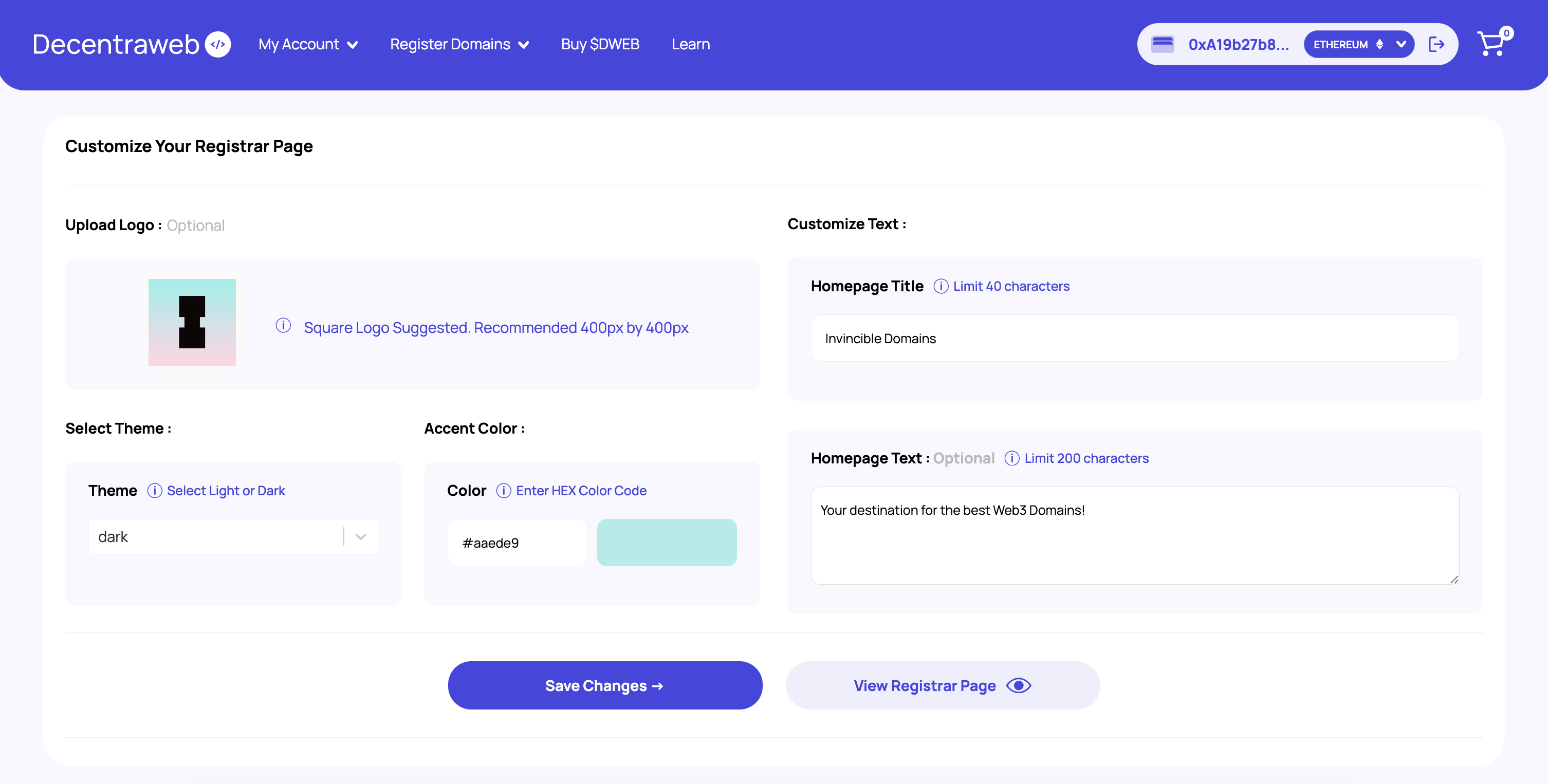 In our Invincible Domains example we've : - Added in our Logo - Opted for the Dark Theme - Provided our Accent Color - #aaede9 - Added our Homepage Title - Invincible Domains - Added our Homepage Text - Your destination for the best Web3 Domains! Press Save Changes and confirm with signature within your wallet