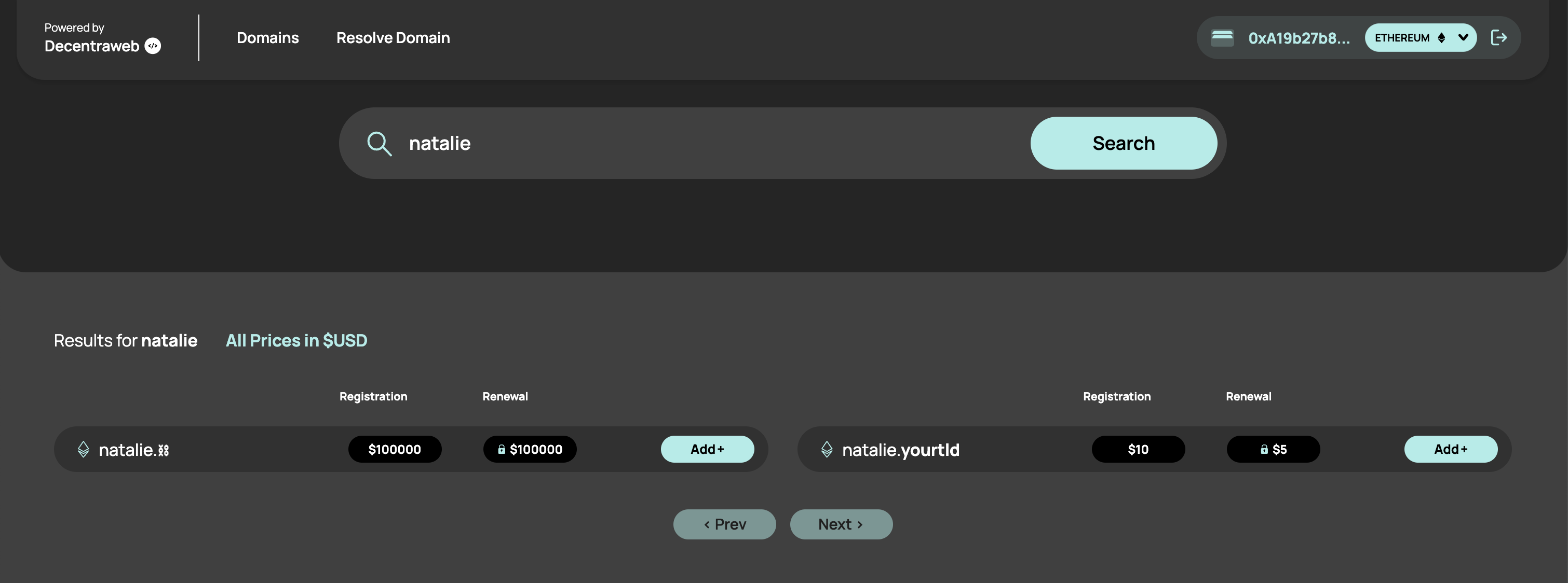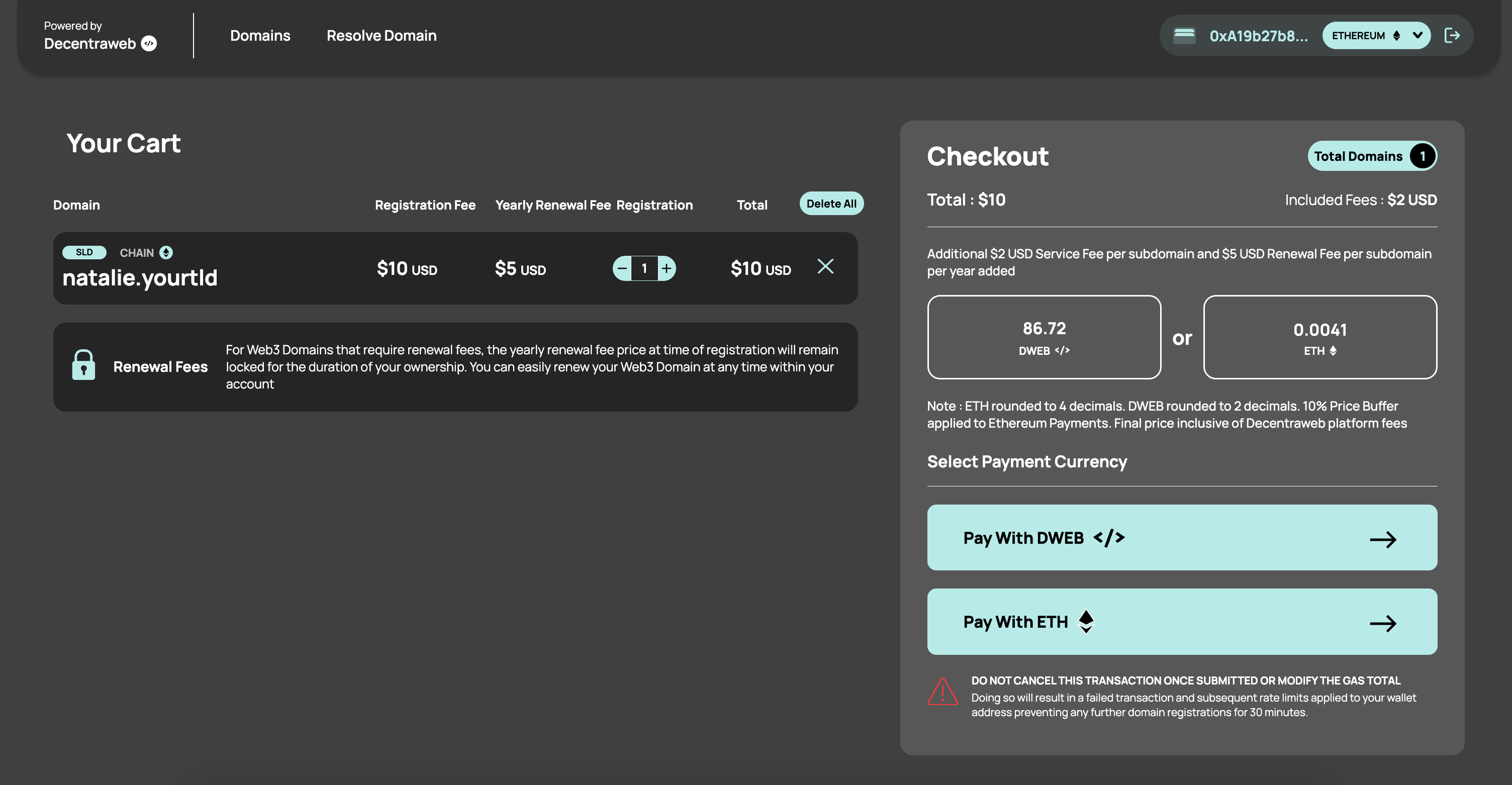 Users of your Registrar Site can add Web3 Domains to their cart and transact in their selected currency.